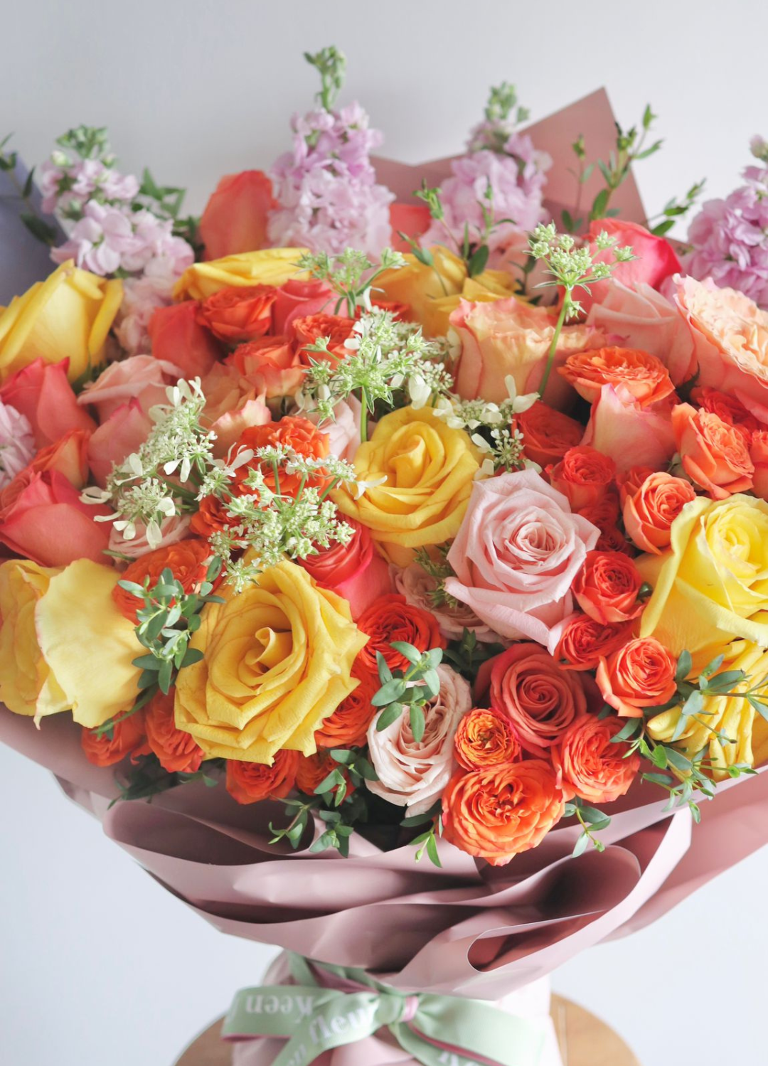 “NARANJA” consists of Ecuadorian roses, small roses, seasonal flower filters and Eucalyptus