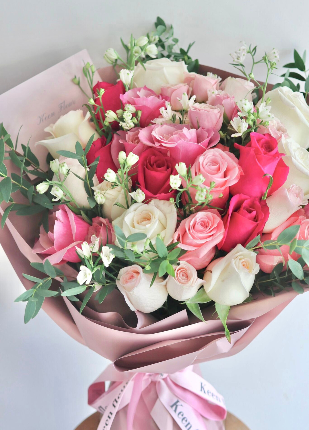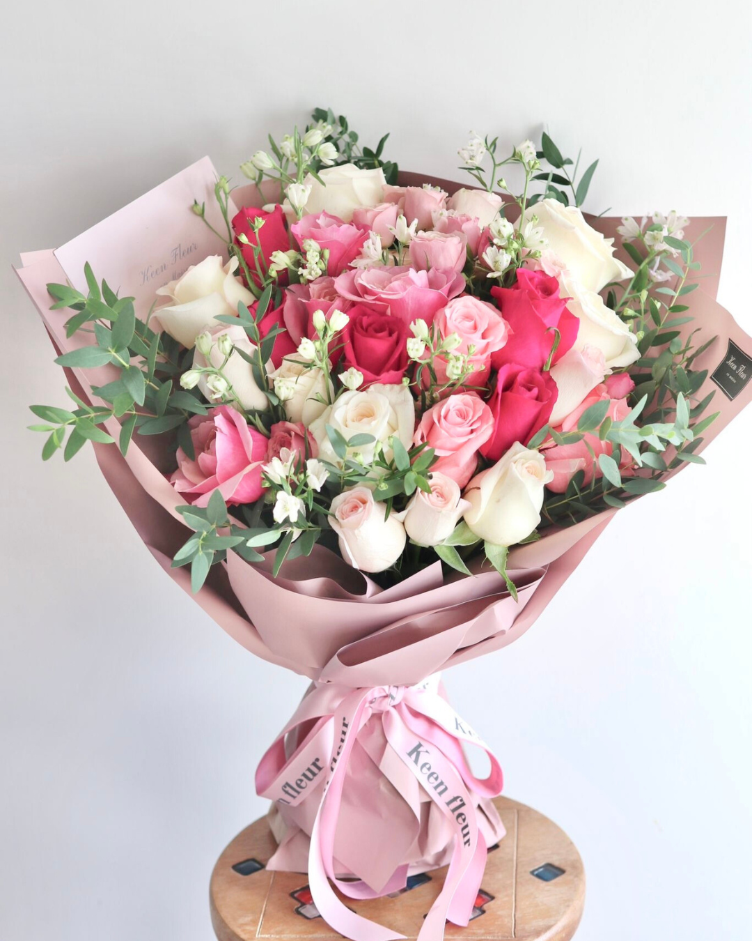 “BARBIE” consists of Ecuadorian roses, seasonal flower filters and Eucalyptus