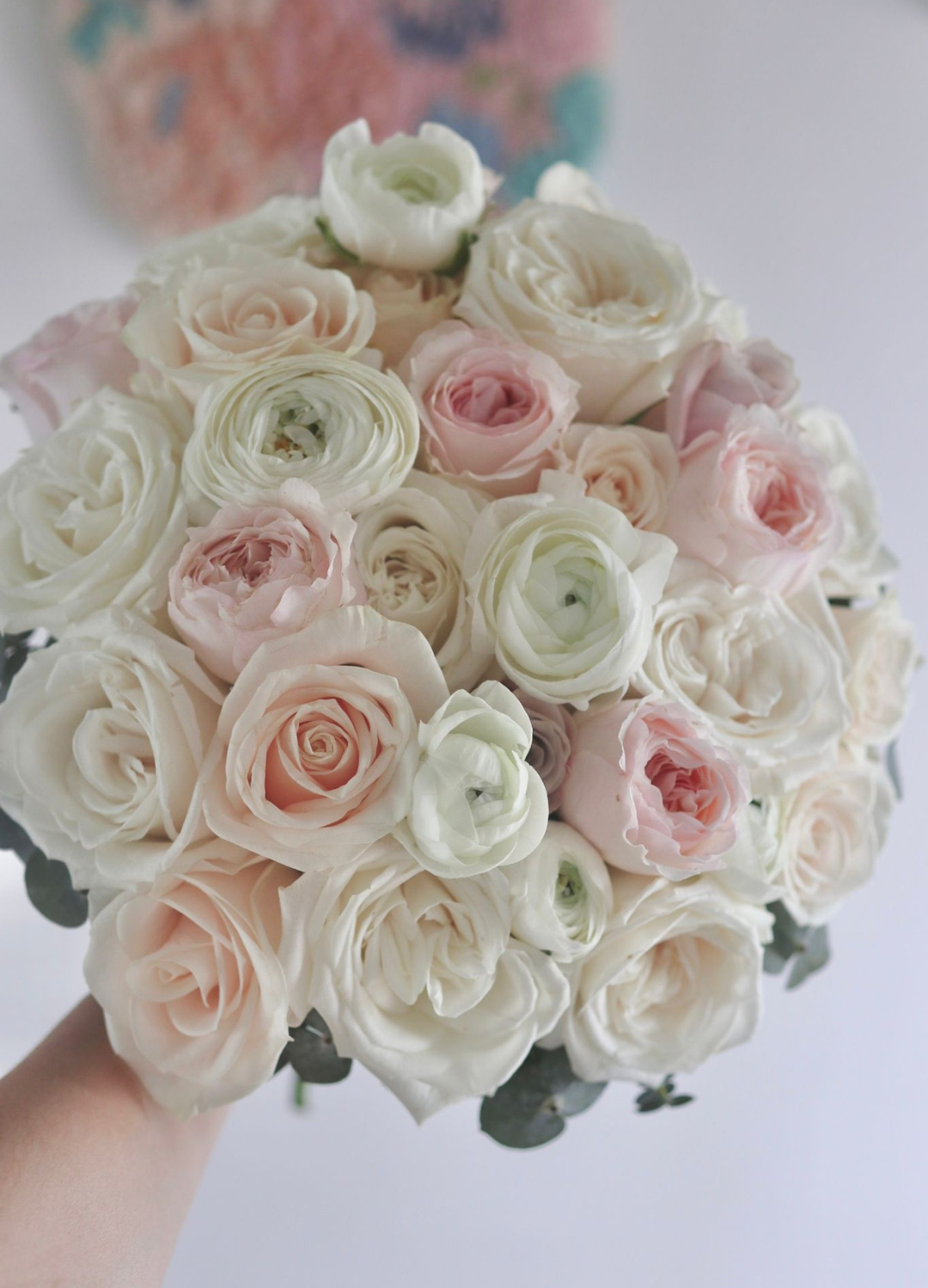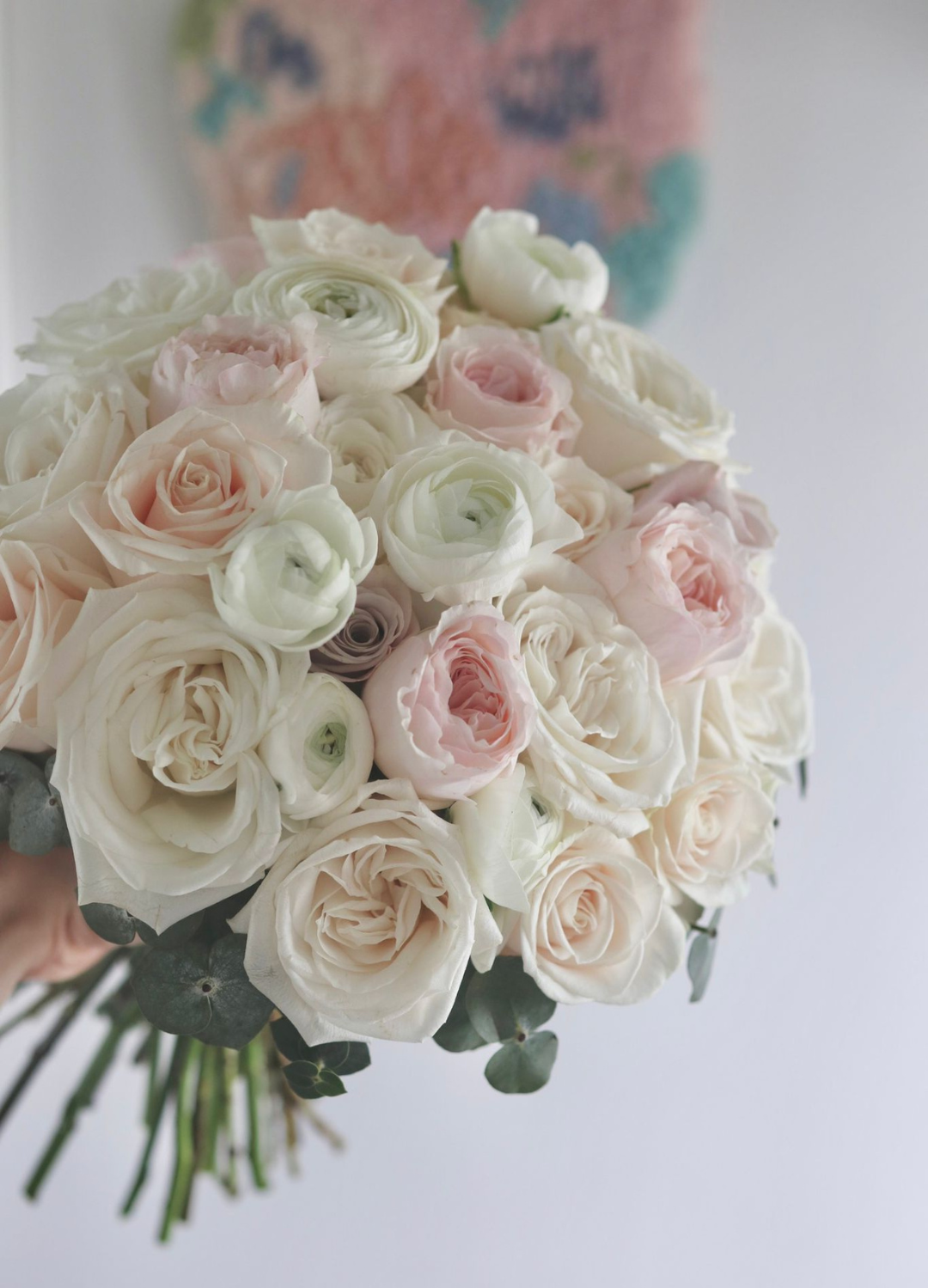“ELEGANCE” consists of Ohara rose, Ecuadorian roses, Ranunculus and Eucalyptus.