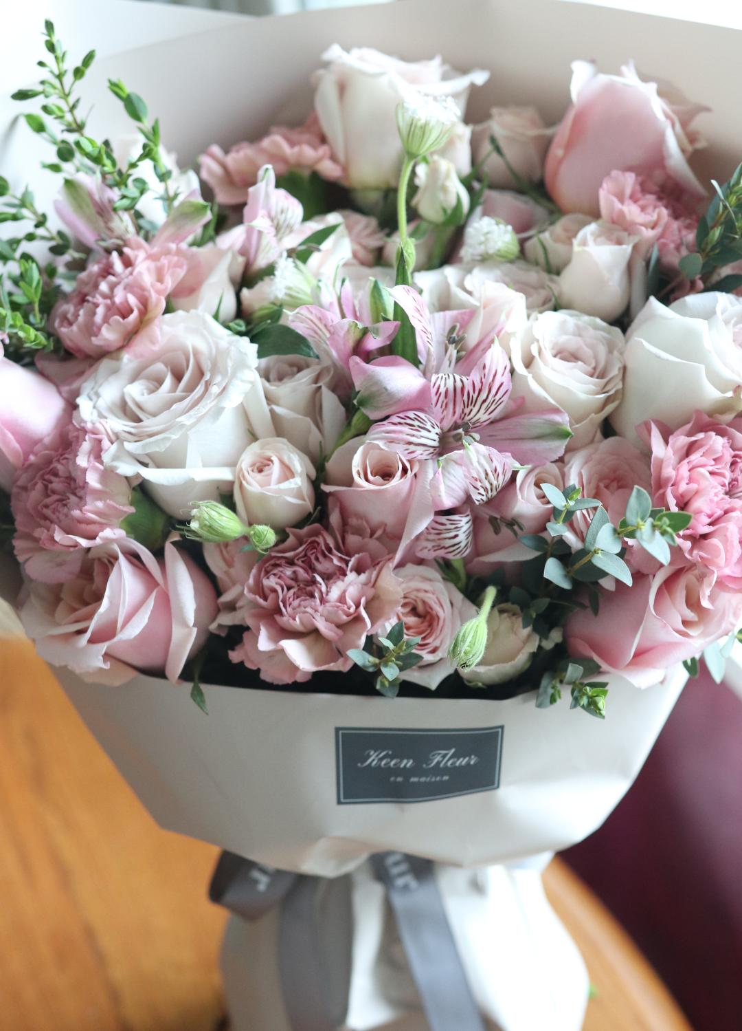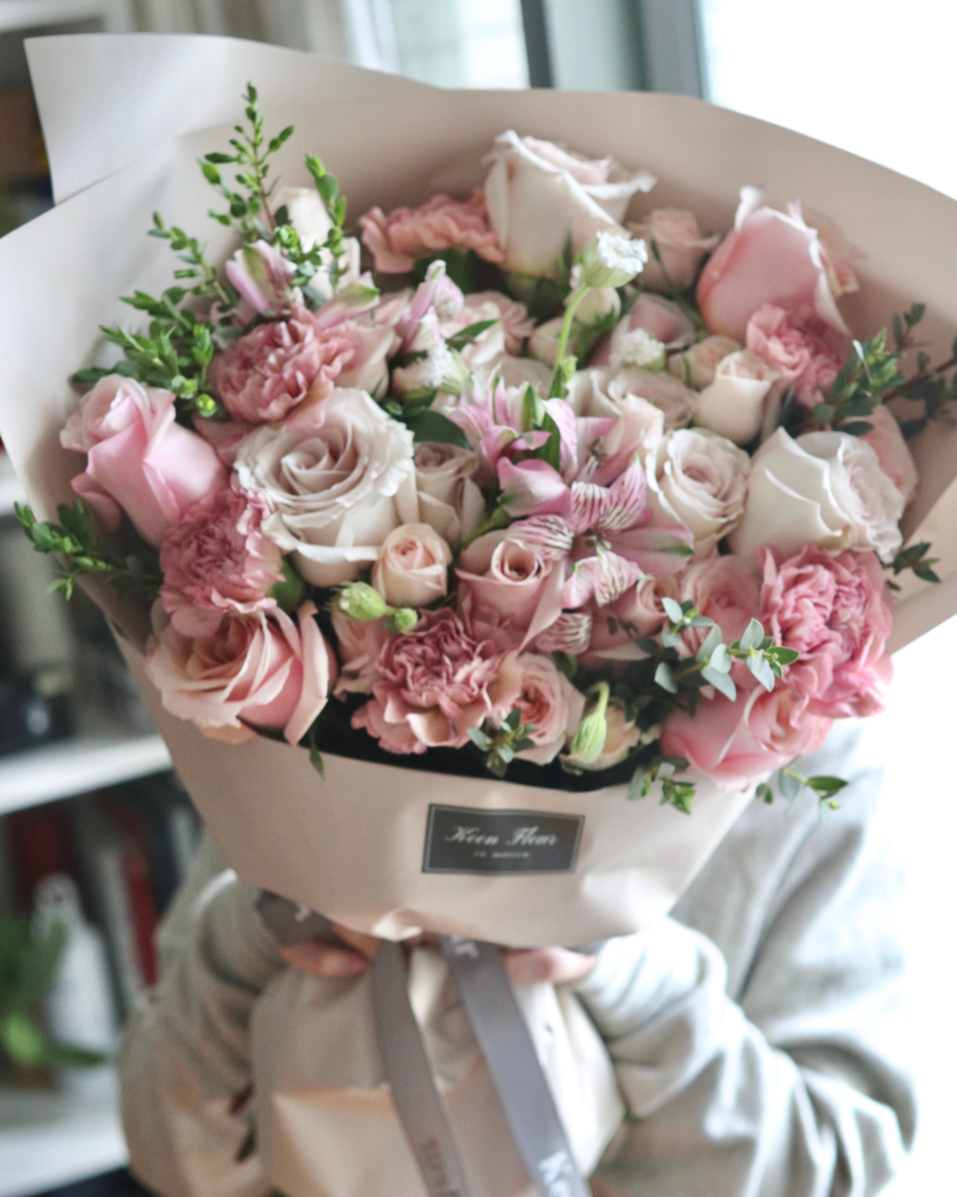 “GENTLE KISS” consists of Ecuadorian roses, Carnation, Alstroemerias, small roses, seasonal flower filters and Eucalyptus