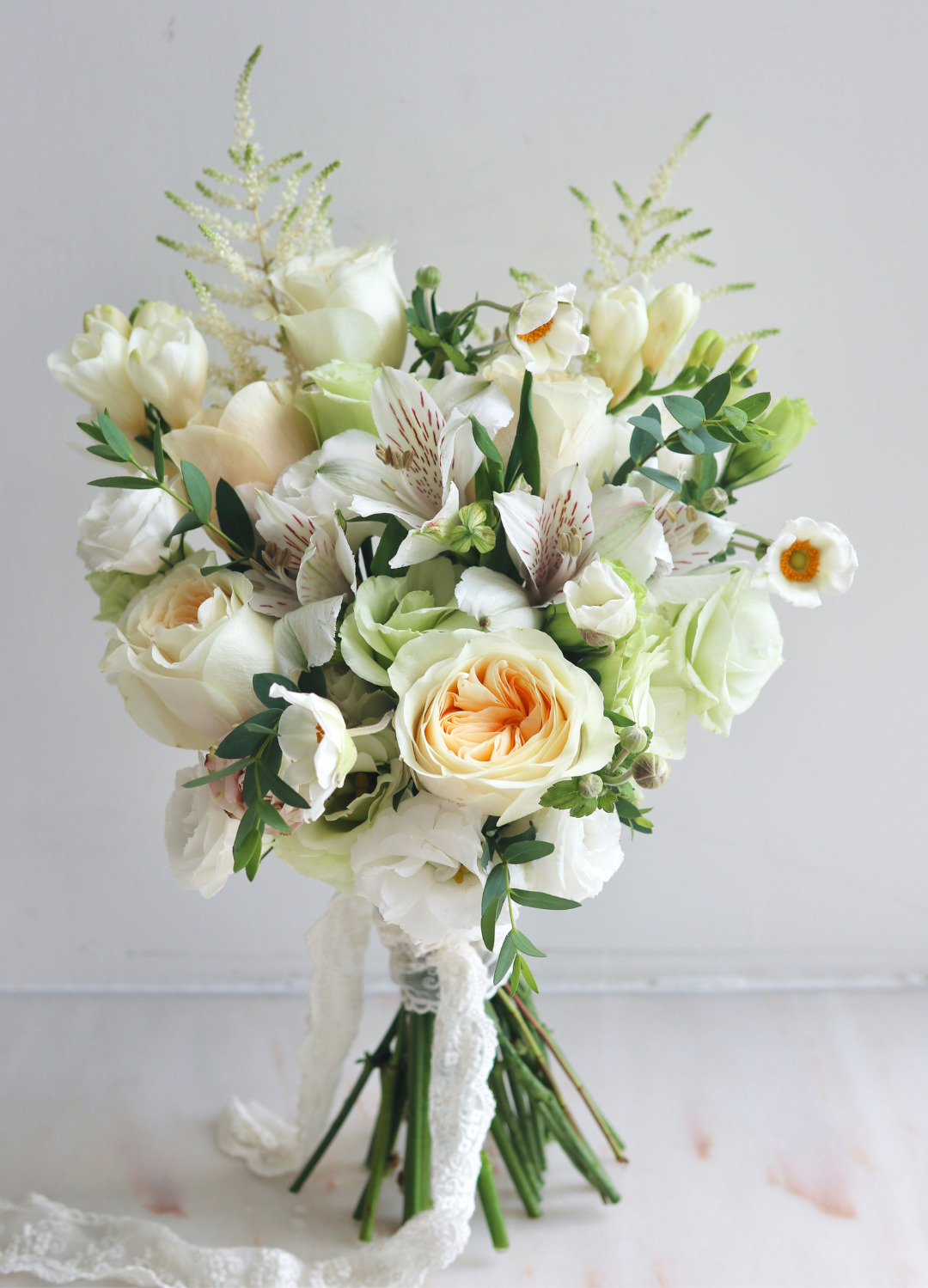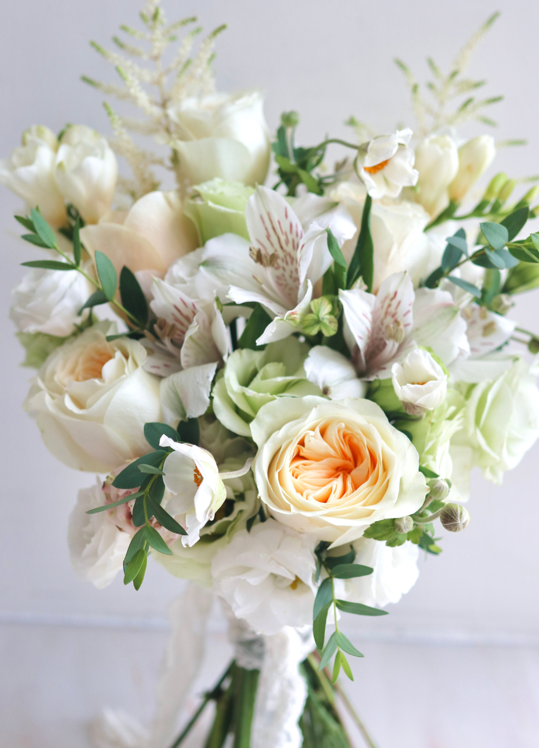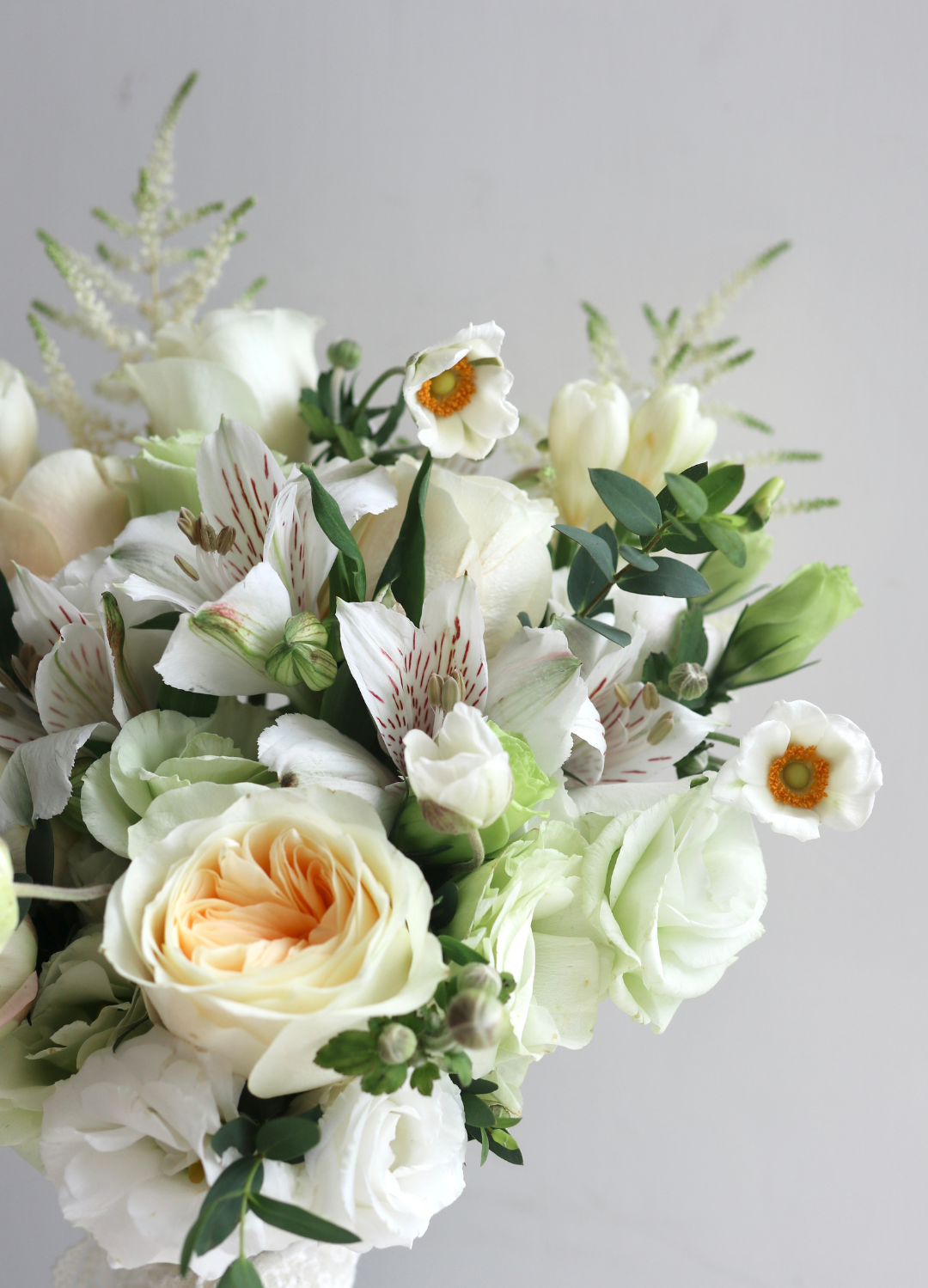 "LINEN” consists of Ecuadorian roses,  Alstroemerias, Eustoma, Eucalyptus, seasonal flower filters and Eucalyptus.