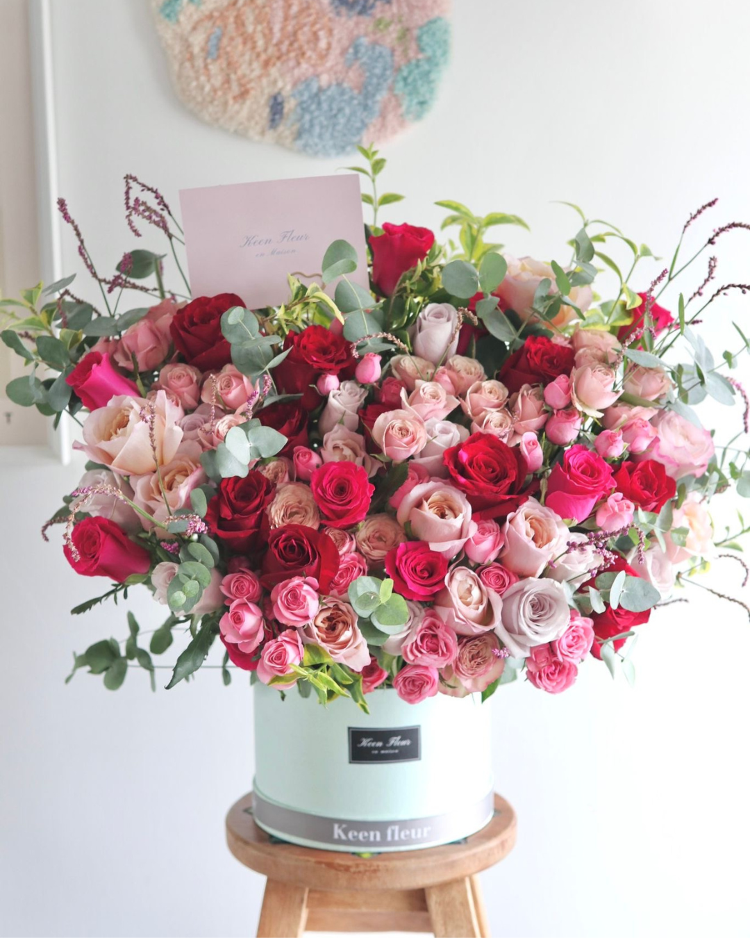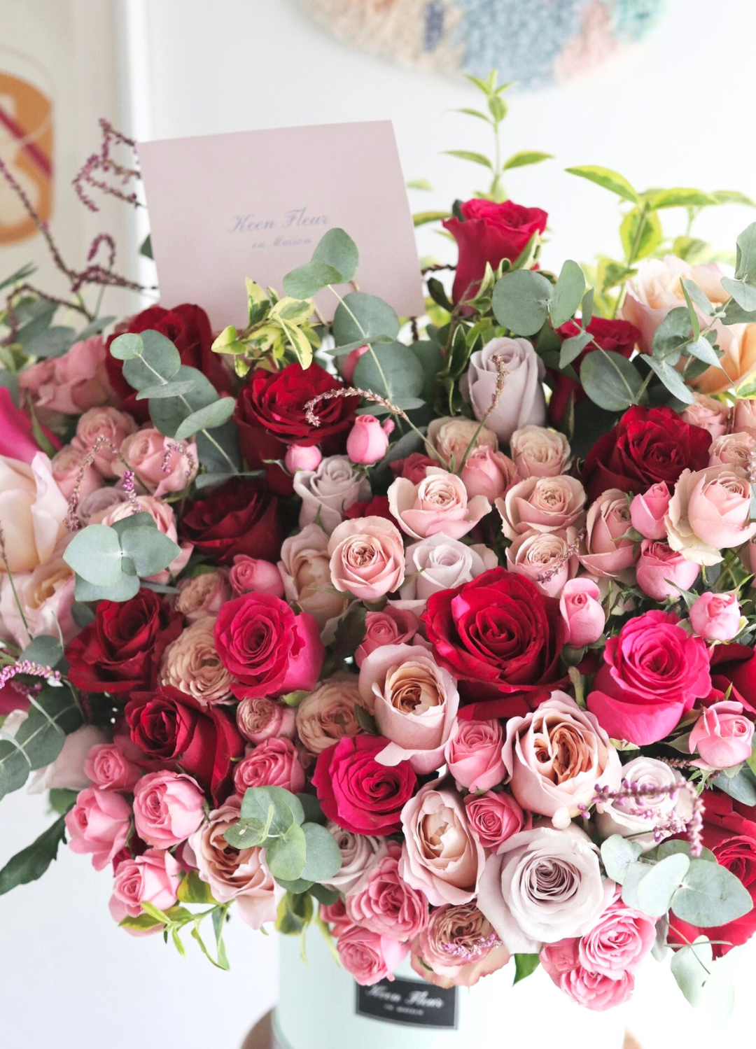 "PASSION" consists of: Premium Ecuadorian roses, small roses and seasonal flower filters and Eucalyptus.