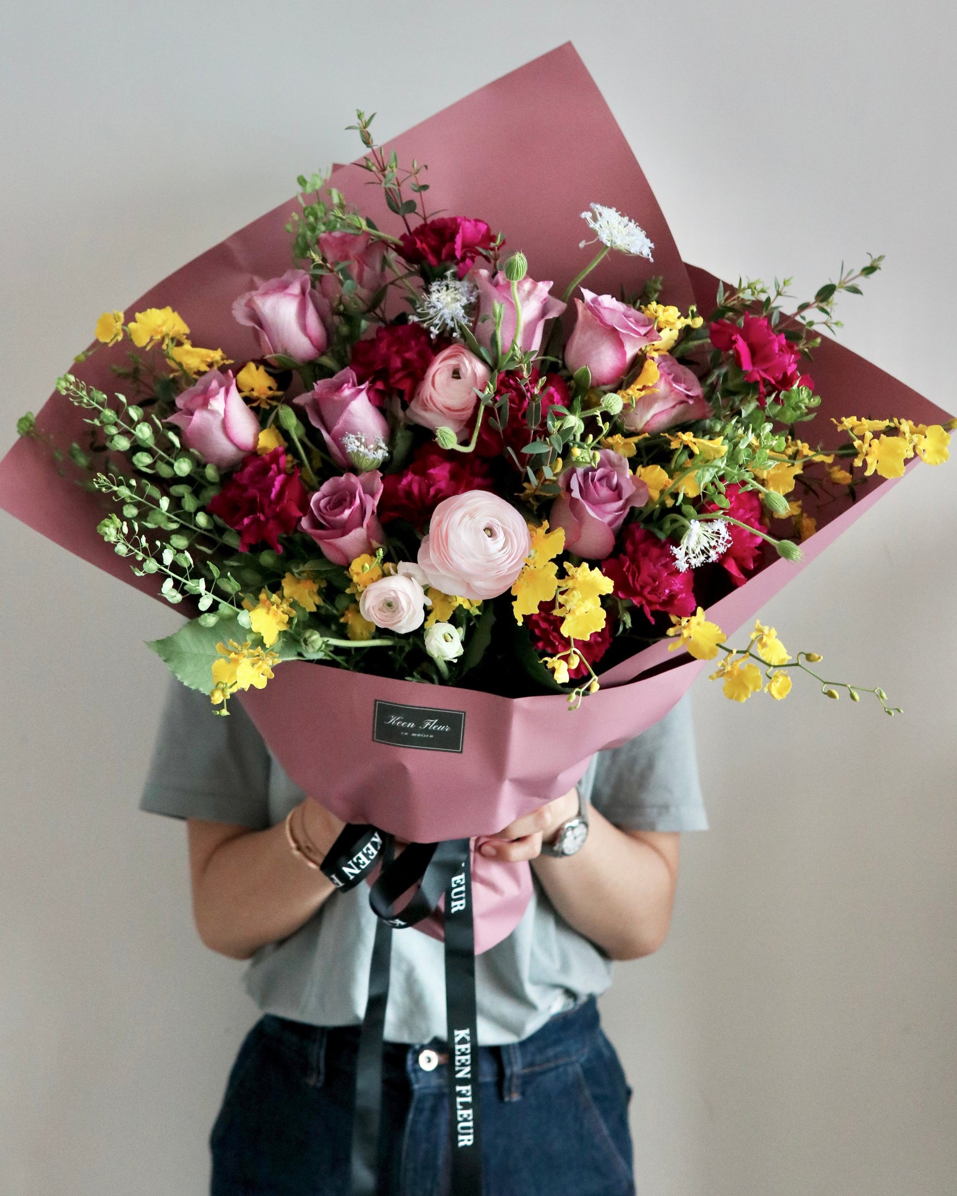 ROSIE LOVE include: Rose, Carnation, Ranunculus,  Oncidium, Seasonal flower filters and Eucalyptus