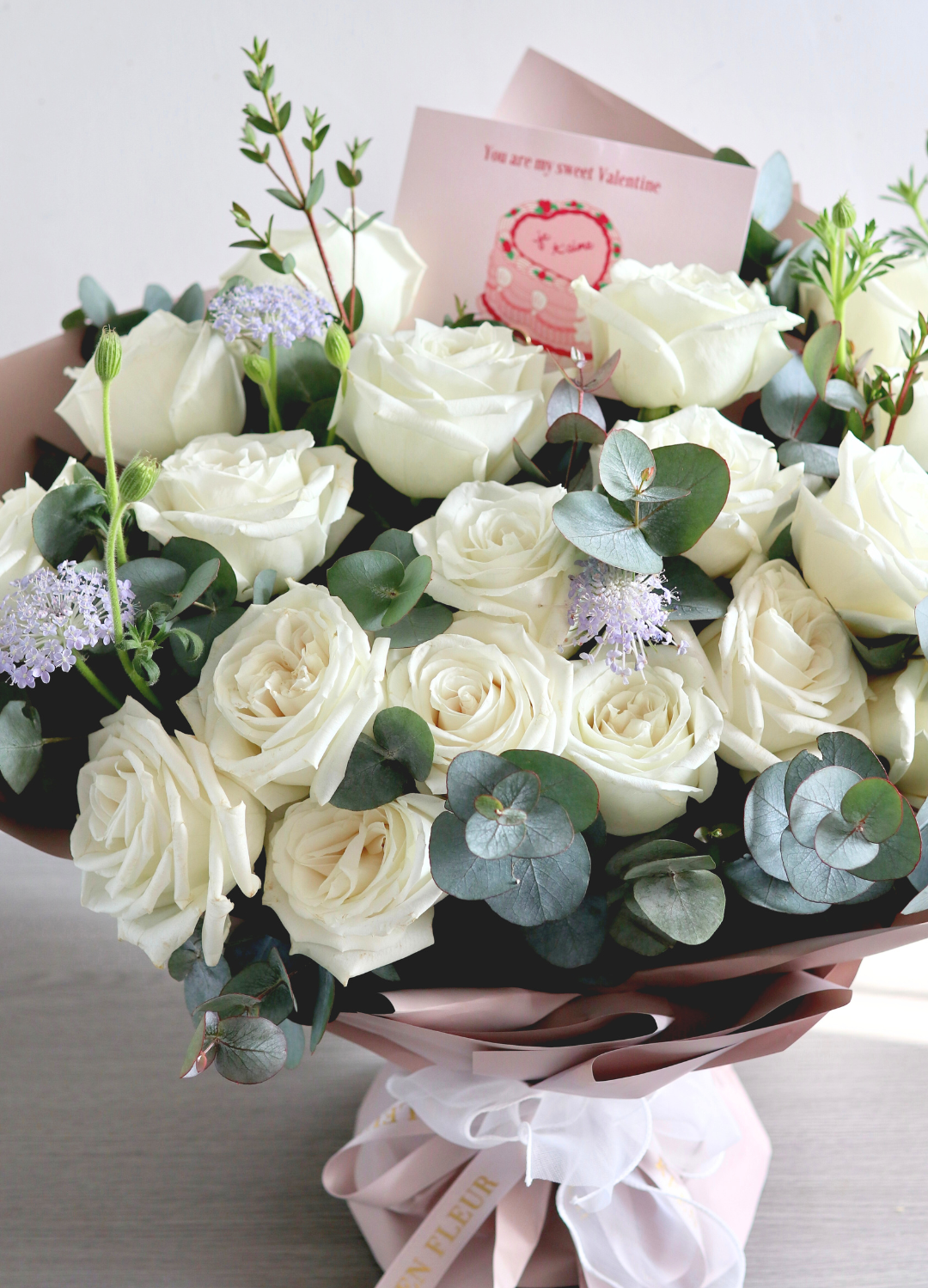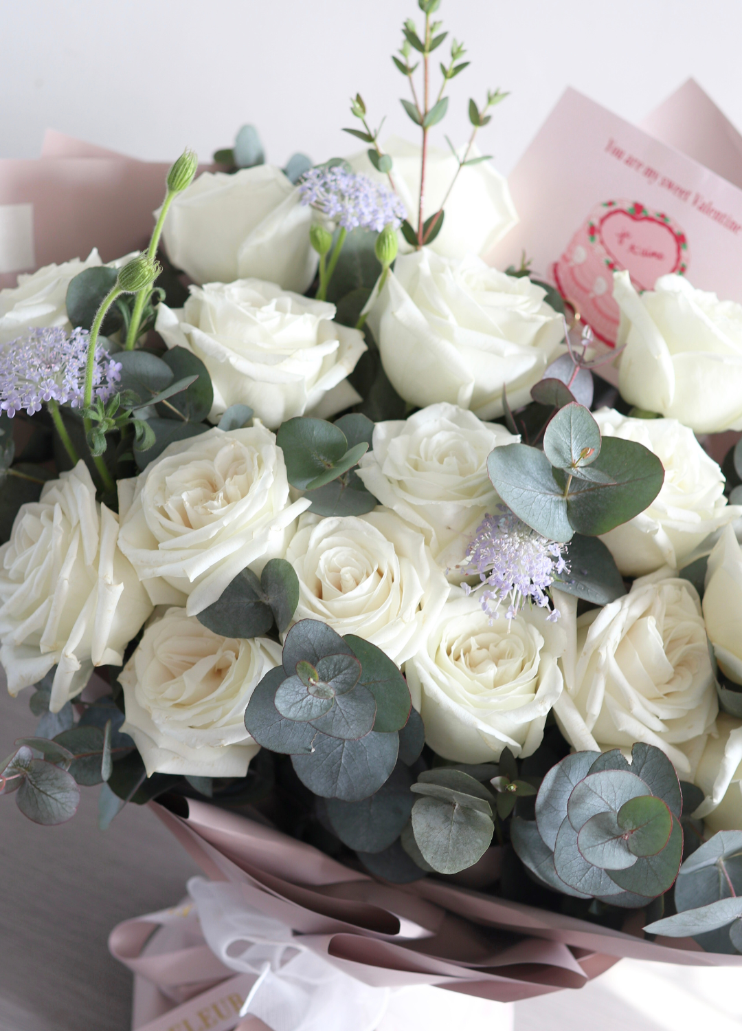 “PURE LOVE” consists of premium Ecuadorian roses and seasonal flower filters.