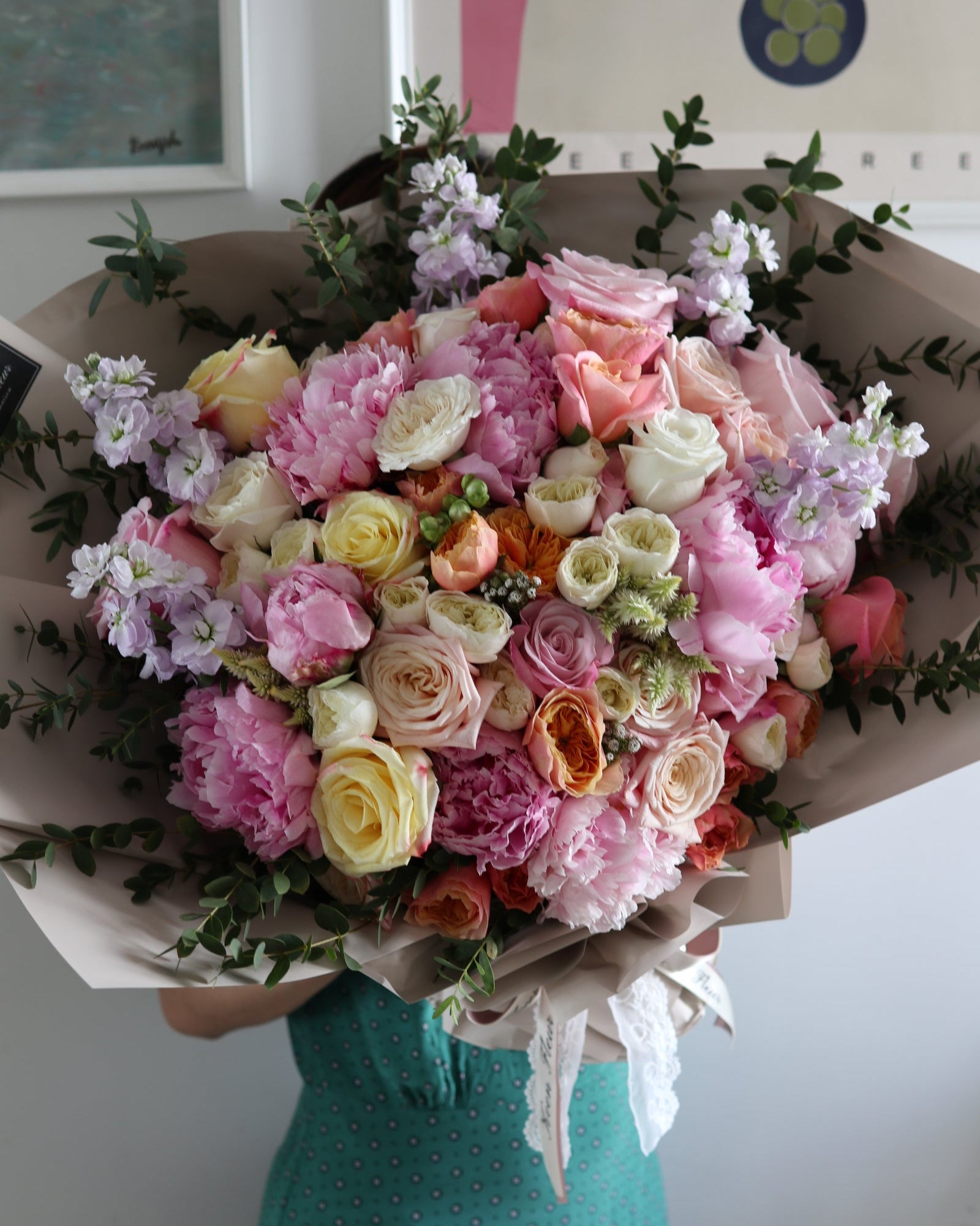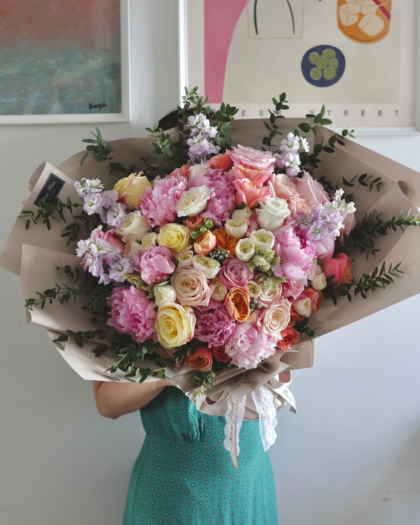 "Elizabeth" is a Queen Size Bouquet consists of high-quality imported rose, peonies and seasonal flower filters.