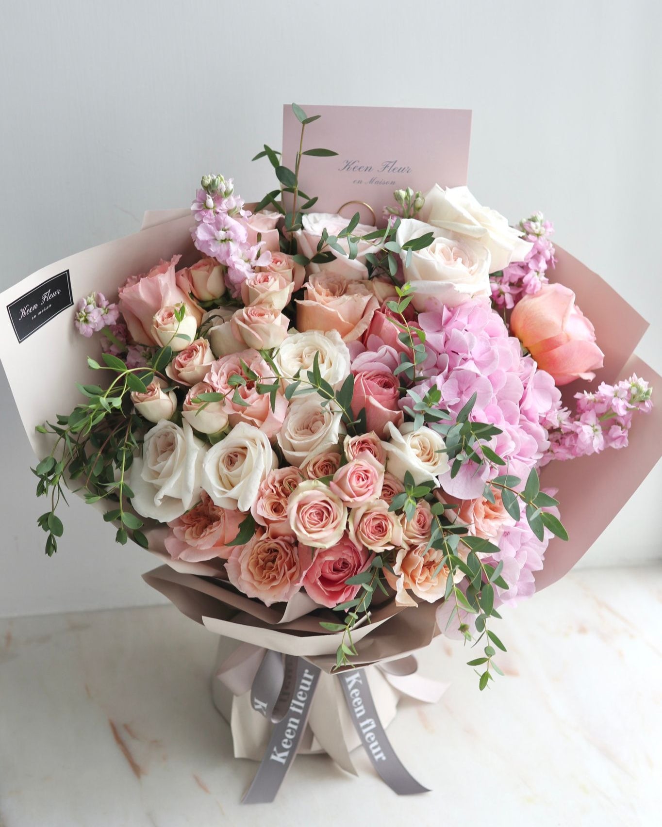 “SHIMMER” consists of Ecuadorian roses (including Shimmer, White Ohara rose), small roses, hydrangea, seasonal flower filters and leaves.